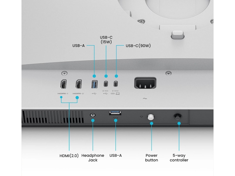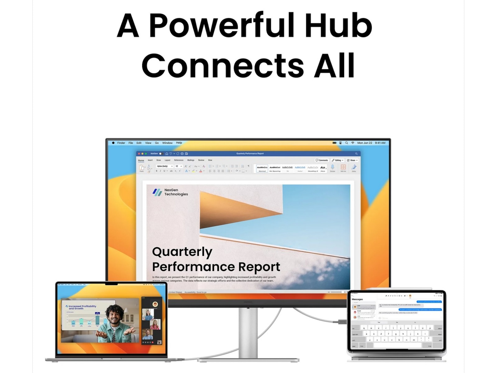 USB-C (DisplayPort Alt-modus, data, effekt opp til 90 W), 2 x nedstrøms USB 3.2 Gen 1 (strøm opptil 7,5W), 2 x HDMI, Hodetelefonkontakt (mini-jack), Nedstrøms USB-C 3.2 Gen 1 (strøm inntil 15 W)