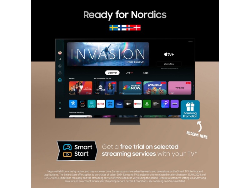 *Gjelder ved kjøp av utvalgte Samsung TV-er fra 2024 og utvalgte projektormodeller på samsung.com og hos utvalgte forhandlere i perioden 29.04.2024–31.03.2025. Underlagt begrensninger, og strømmetjenestetilbudene som inngår, kan variere i løpet av kampanjen. Krever Samsung-konto og at kunden oppretter konto hos den aktuelle strømmetjenesten. Vilkår: samsung.com/no/smartstart"