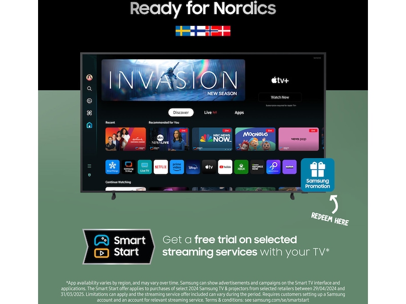 *Gjelder ved kjøp av utvalgte Samsung TV-er fra 2024 og utvalgte projektormodeller på samsung.com og hos utvalgte forhandlere i perioden 29.04.2024–31.03.2025. Underlagt begrensninger, og strømmetjenestetilbudene som inngår, kan variere i løpet av kampanjen. Krever Samsung-konto og at kunden oppretter konto hos den aktuelle strømmetjenesten. Vilkår: samsung.com/no/smartstart