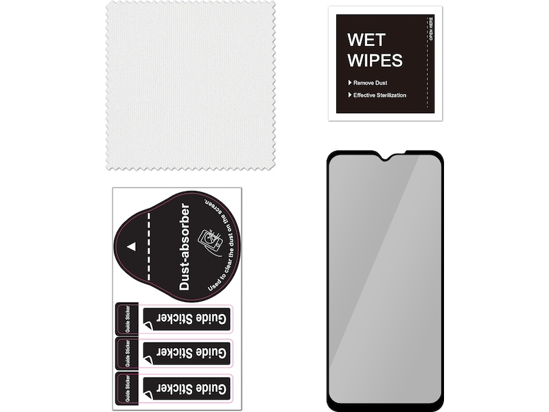 Pakkeinnhold Våte renseservietter, Rengjøringsklut, Føringsklistremerker, Skjermbeskyttelse, Støvabsorber