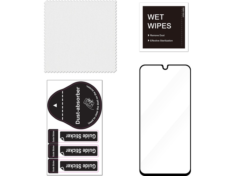 Pakkeinnhold Rengjøringsklut, Føringsklistremerker, Støvabsorber, Våte renseservietter, Skjermbeskyttelse