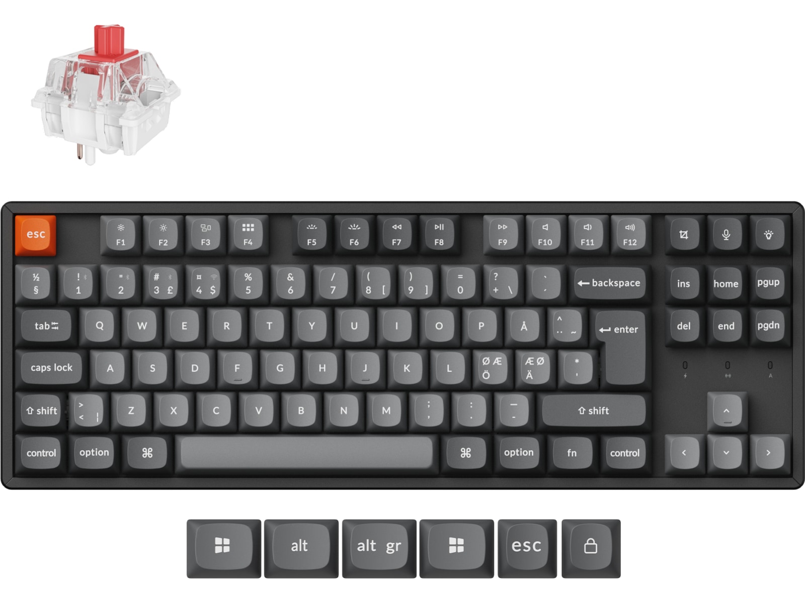 I tillegg kan du konfigurere forskjellige tastetabeller for både Mac- og Windows-enheter med Keychron Launcher NETT-app. Tastaturet inkluderer tastaturkapsler for både macOS og Windows, sammen med ekstra esc- og enter-taster, som gjør det enkelt å bytte mellom operativsystemene.