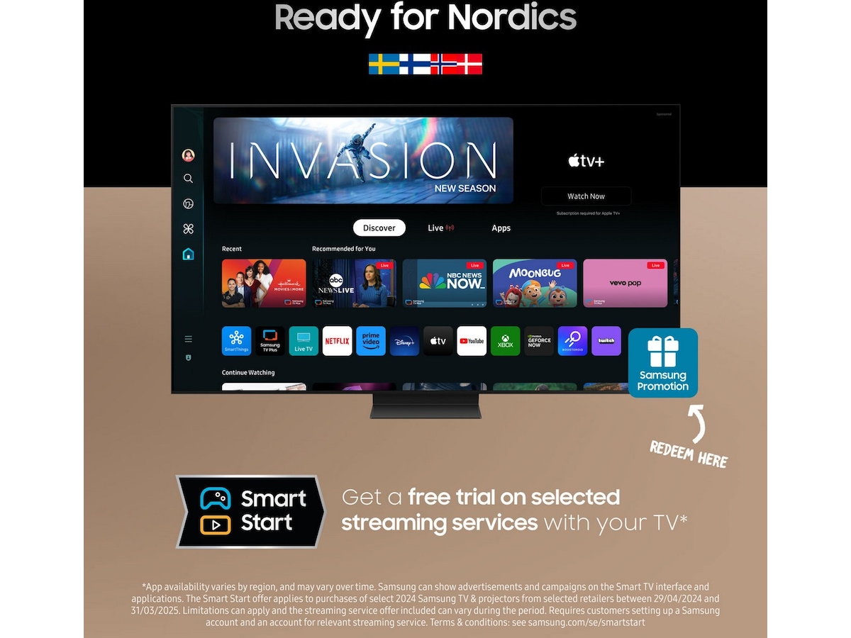 *Gjelder ved kjøp av utvalgte Samsung TV-er fra 2024 og utvalgte projektormodeller på samsung.com og hos utvalgte forhandlere i perioden 29.04.2024–31.03.2025. Underlagt begrensninger, og strømmetjenestetilbudene som inngår, kan variere i løpet av kampanjen. Krever Samsung-konto og at kunden oppretter konto hos den aktuelle strømmetjenesten. Vilkår: samsung.com/no/smartstart"