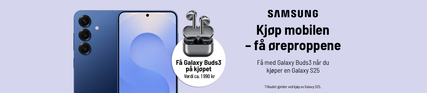Ved kjøp av utvalgte Galaxy S25 i kampanjeperioden får du, Galaxy Buds3 (Silver) med på kjøpet (verdi ca 1990 NOK) hos utvalgte forhandlere.