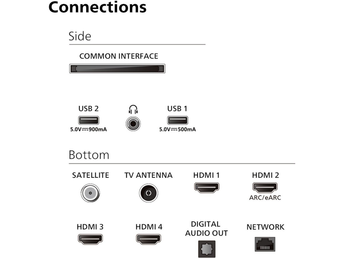 Kontakttype LAN - bunn, Hodetelefoner - side, Digital lydutgang (optisk) - bunn, 4 x HDMI - bunn, 2 x USB - side