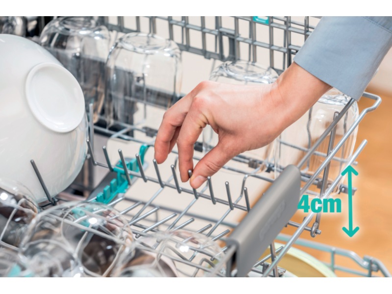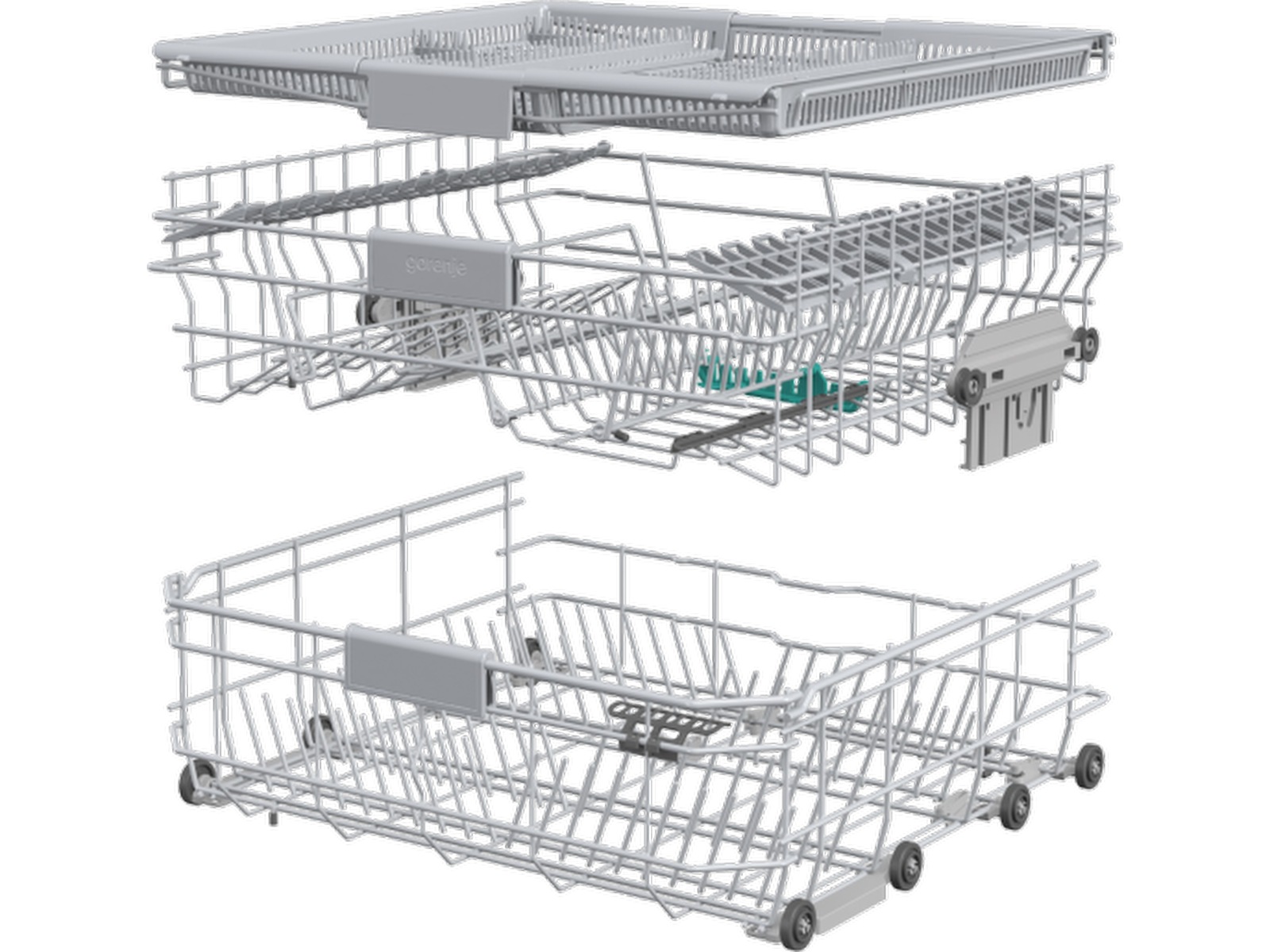 Kurvene er utstyrt med fremhevede, flyttbare elementer og et justerbart kurvoppsett for å gjøre det enkelt å sette ting i oppvaskmaskinen. Det virkelig enkle systemet for justering av kurver i to nivåer gjør at du får plass til selv de største grytene og tallerkenene. Tallerkenstativet in den nedre kurven kan enkelt foldes sammen. Bestikk kan organiseres perfekt på et spesialbrett, der de er plassert adskilt, for perfekte vaske- og tørkeresultater. Hver minste lille detalj er omhyggelig designet for å gi så enkel bruk som mulig.
