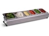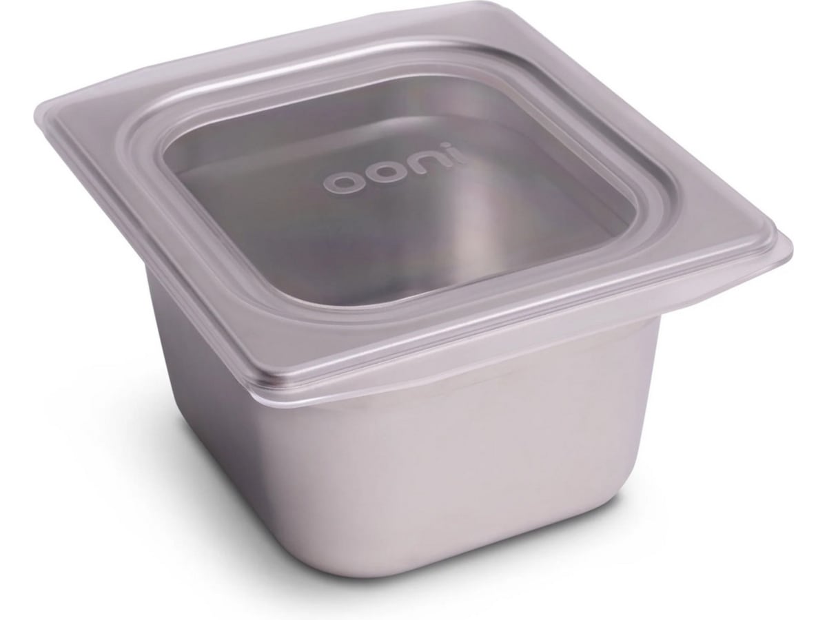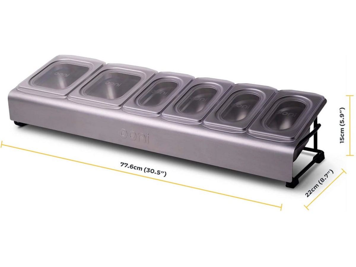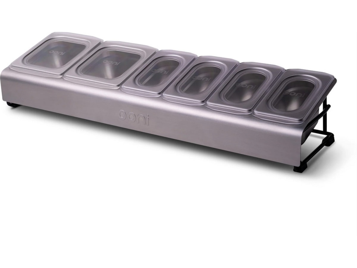 De to 1.6L og fire 0.8L Ooni Pizza Topping beholderne sikrer at du har rikelig med toppings for å holde pizzaen flytende. De spesialtilpassede klare lokkene for hver beholder gjør at de enkelt kan stables og oppbevares i kjøleskapet. Den værbestandige, pulverlakkerte rammen og rustfritt stål-lokket passer perfekt på våre Ooni Modular Tables, og det er enkelt å transportere for rengjøring og oppbevaring. Bygg ditt utendørs kjøkken og heve din pizzaforberedelse med Ooni Pizza Topping Station.