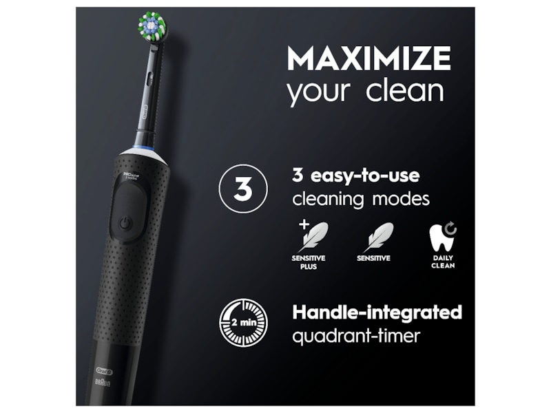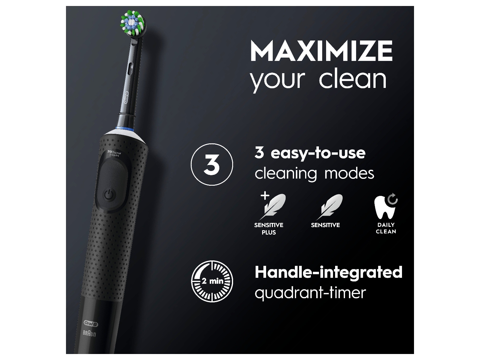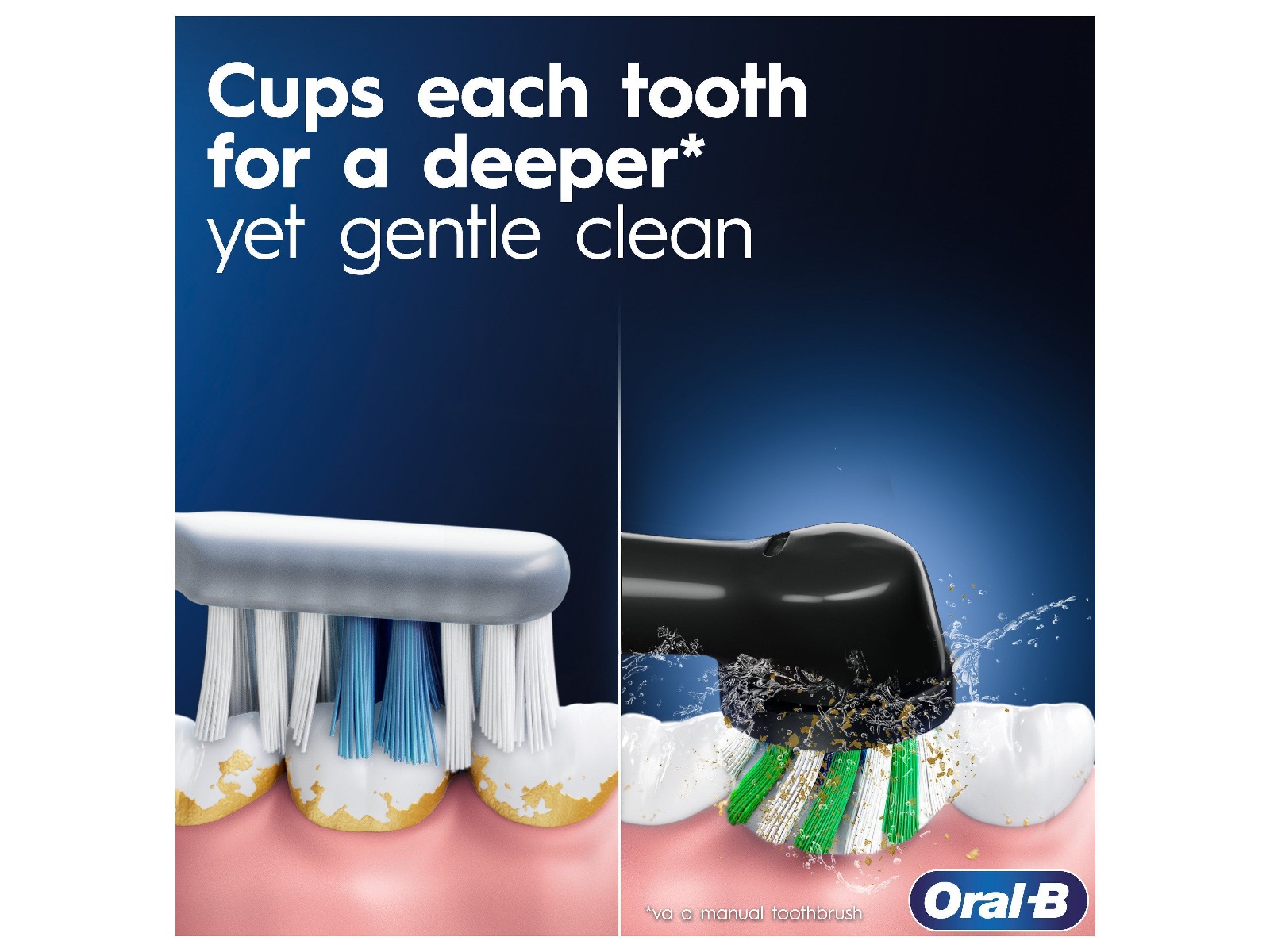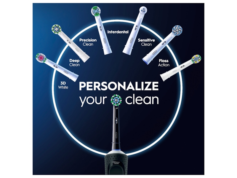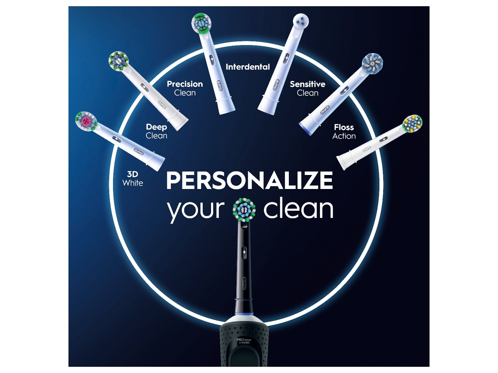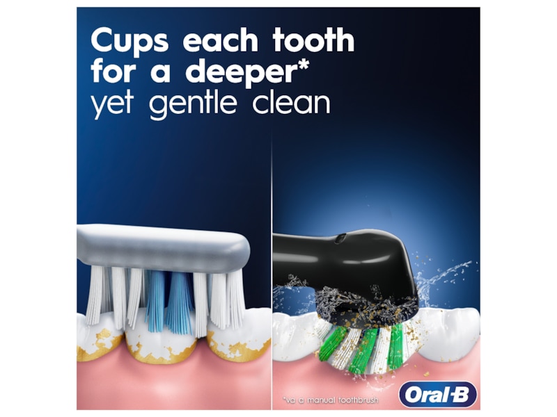 Vitality Pro bruker en kombinasjon av oscillerende og roterende bevegelser for å fjerne opptil 100 % mer plakk sammenlignet med en manuell tannbørste, og sikrer en grundig rengjøring av tennene.
