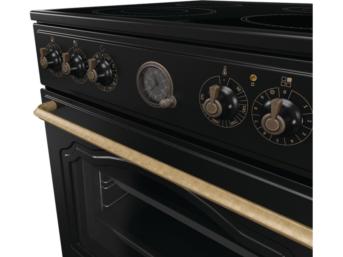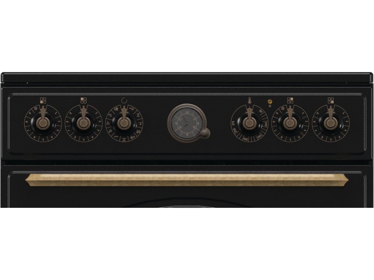 Denne komfyren har et sort stilrent design med sort glass og kontrollpanel av lakkert metall, som vil se fantastisk ut i ethvert kjøkken.