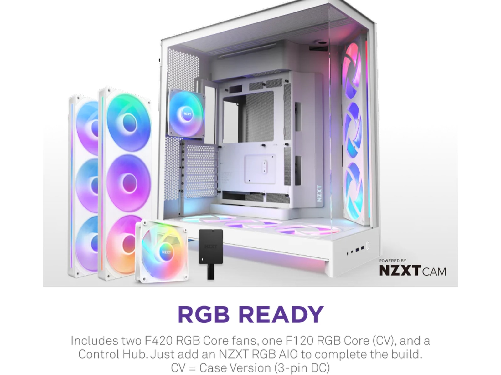 - RGB Klar: Inkluderer to F420 RGB Core enkeltrammevifter, én F120 RGB Core (CV) vifte i bak, og en NZXT Control Hub. CV = Case Version (3-pins DC)