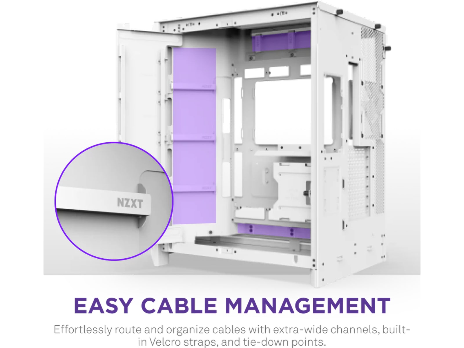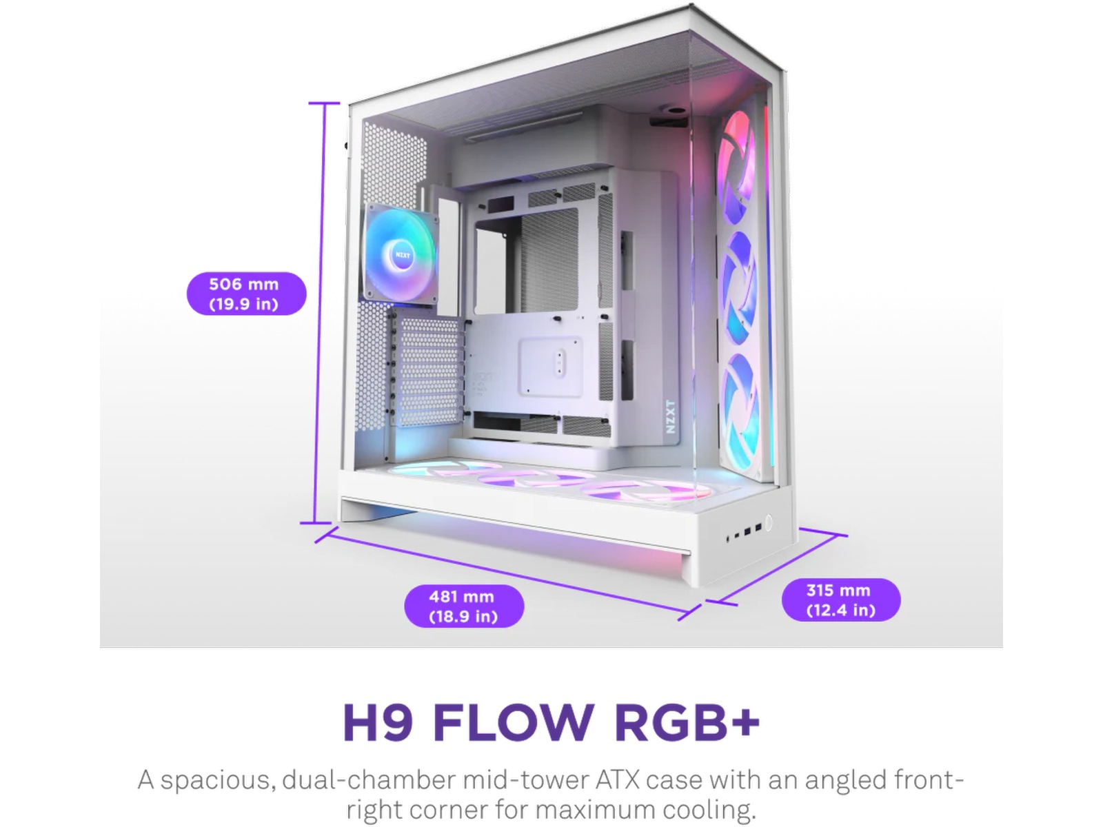 H9 Flow er et romslig mellomstore ATX-kabinett designet for bygg med høy ytelse, som balanserer luftstrøm og estetikk. Dens dobbeltkammerdesign forbedrer kjøling og kabelhåndtering, mens perforerte paneler, vinklete vifter og rikelig støtte for vifter og radiatorer gir optimal termisk ytelse.