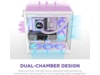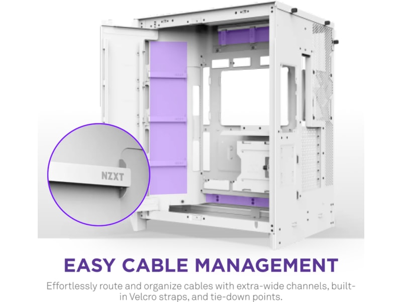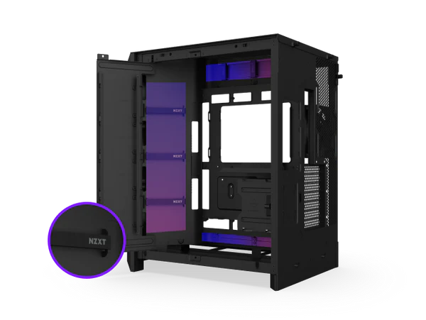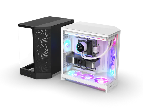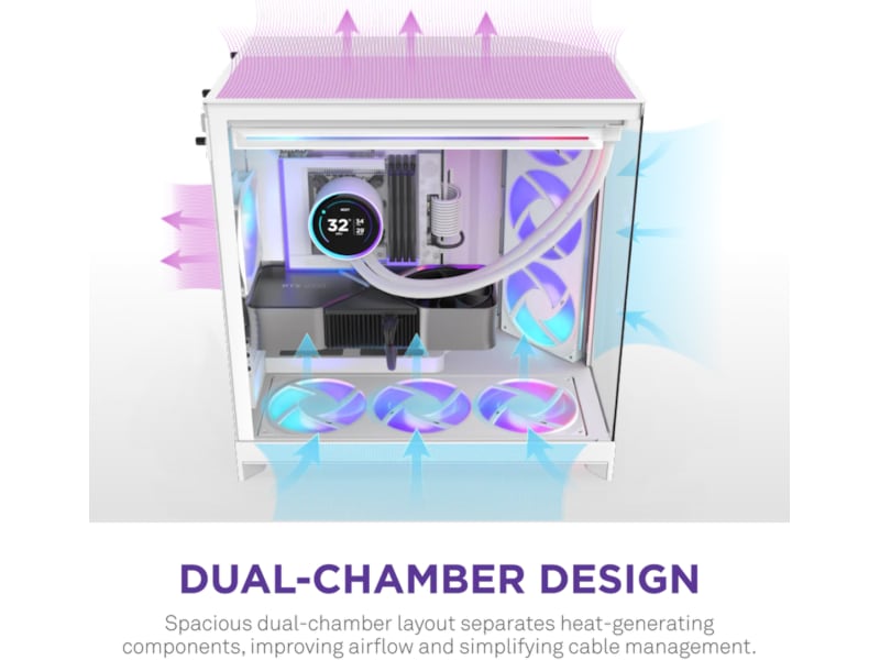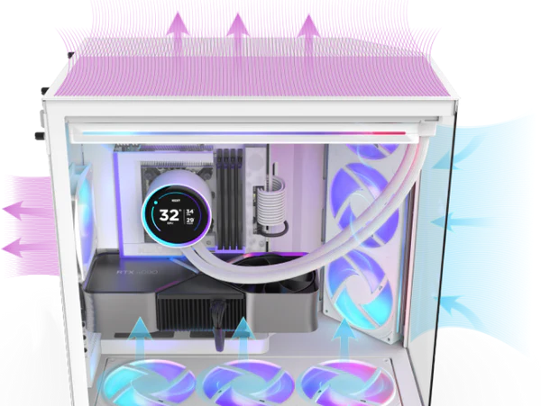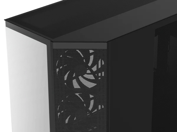 H9 Flow er et romslig mellomstore ATX-kabinett designet for bygg med høy ytelse, som balanserer luftstrøm og estetikk. Dens dobbeltkammerdesign forbedrer kjøling og kabelhåndtering, mens perforerte paneler, vinklete vifter og rikelig støtte for vifter og radiatorer gir optimal termisk ytelse.