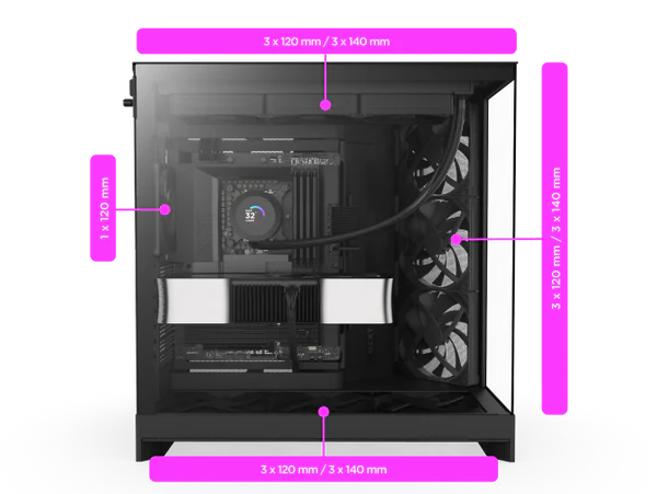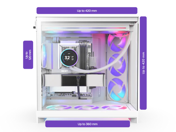 Holder opptil 420 mm radiatorer på topp- og høyre frontpaneler for allsidig kjøling.