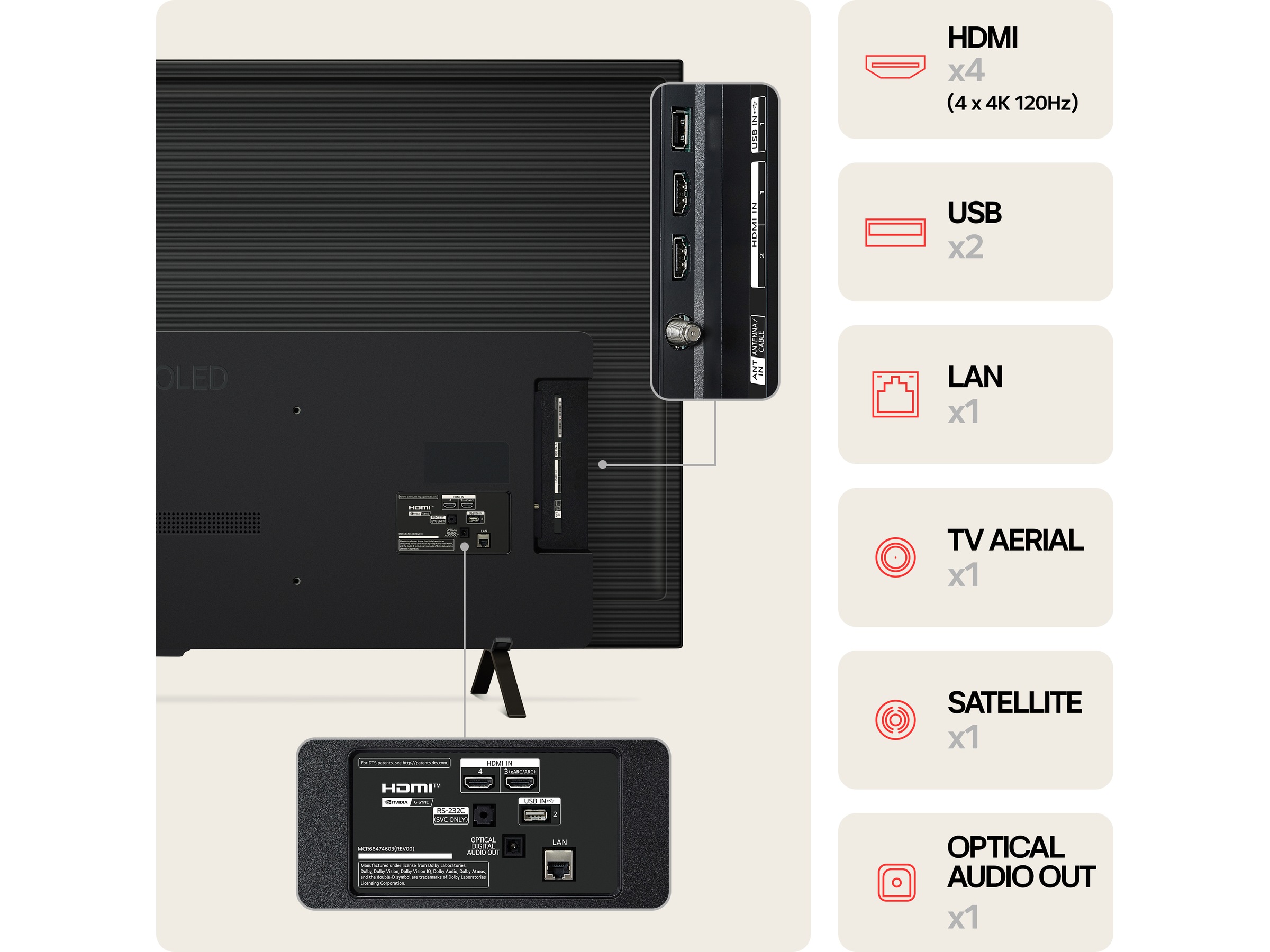| Egenskaper | Family Settings, AI Picture Wizard, AI Brightness Control, Støtte for Apple AirPlay 2, AI Concierge, Cloud Gaming, Støtte for USB-nettkamera, Always Ready, Game Dashboard, Freesync, AI Genre Selection, G-SYNC Compatible, 4K High Frame Rate (HFR) |
