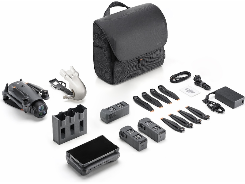 Inkluderer DJI RC 2 fjernkontroll, to ekstra batterier, batteriladingshub, skulderveske, og mer, som gir allsidig støtte for luftfotografering.