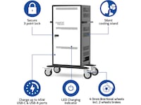 Den integrerte ultra-stille kjøleviften opprettholder den interne temperaturen i kabinettet selv ved intensiv bruk. LED-ladestatusindikatorene tillater sanntids overvåking av statusen til hver enhet, og forenkler den daglige administrasjonen. En ekte tidsbesparelse og fred for brukerne.