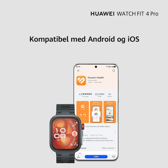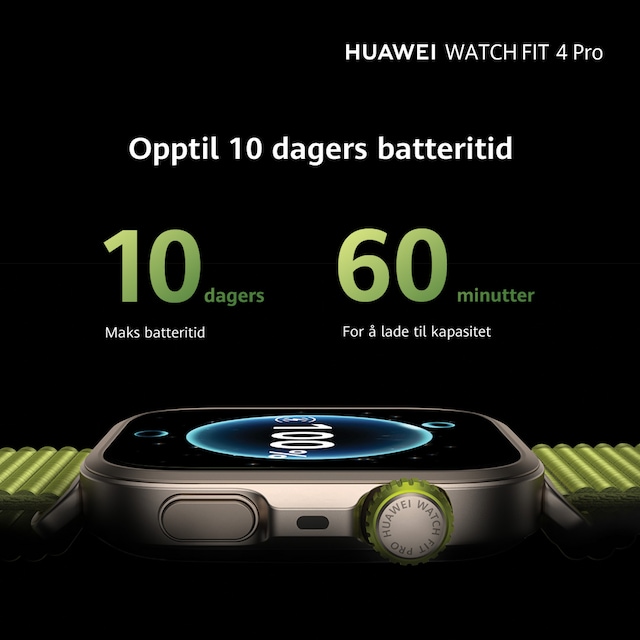 HUAWEI WATCH FIT 4 Pro har et robust design med safirglass og titan, alt i en ultra-thin design på 9,3 mm og en vekt på kun 30 gram. Utrustet med avanserte treningsmoduser som golf og opptil 40 m fridykking, omfattende helsemåling og opptil 10 dagers batteritid. Med smarte varsler og sømløs kompatibilitet med både iOS og Android, er den den perfekte følgesvennen for en aktiv livsstil.