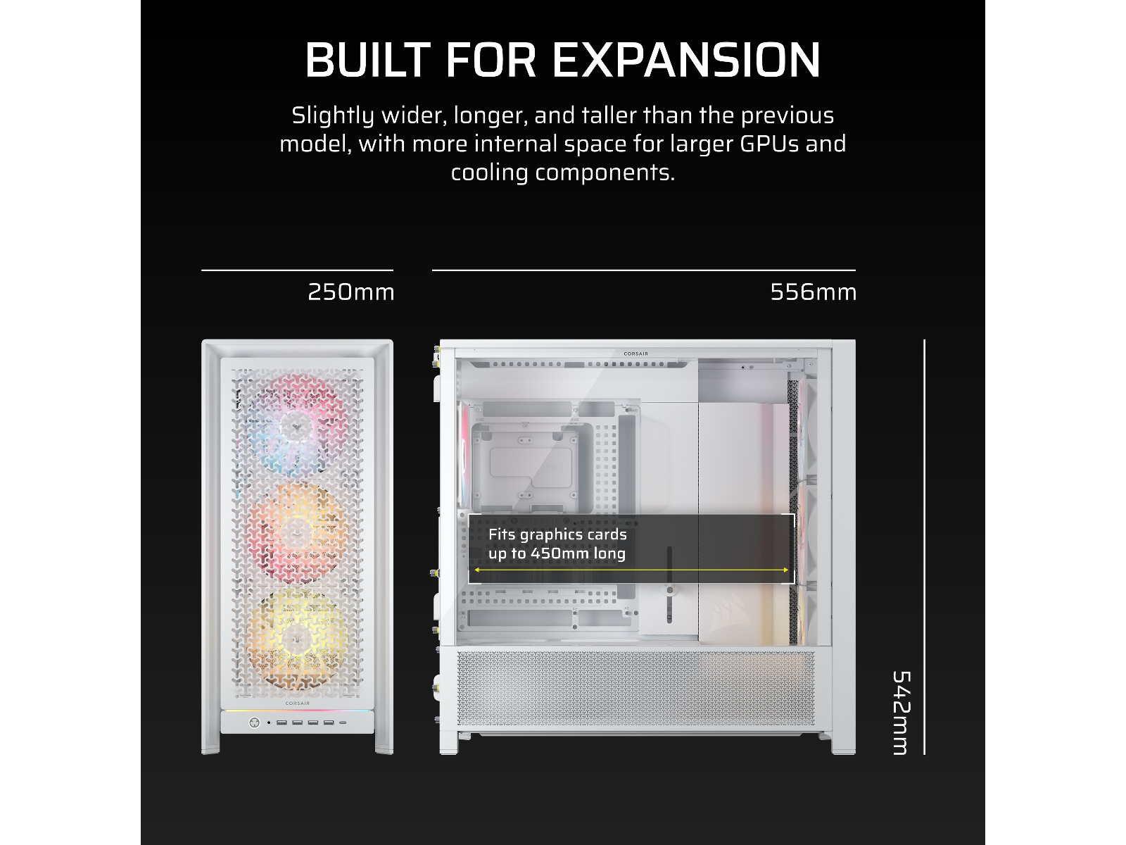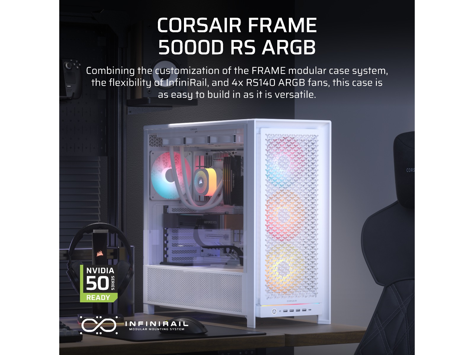 • Elegante detaljer – Frame 5000D inkluderer en rekke funksjoner som viser CORSAIRs oppmerksomhet på detaljer. De inkluderer eksterne kabelhåndteringspunkter, festeskrue som ikke forsvinner, fullt fargematchede nagler, skruer, og plastdeler, et attraktivt Frost White-alternativ, og innebygde roterbare PCI-spor for vertikal GPU-monteringsvifter.