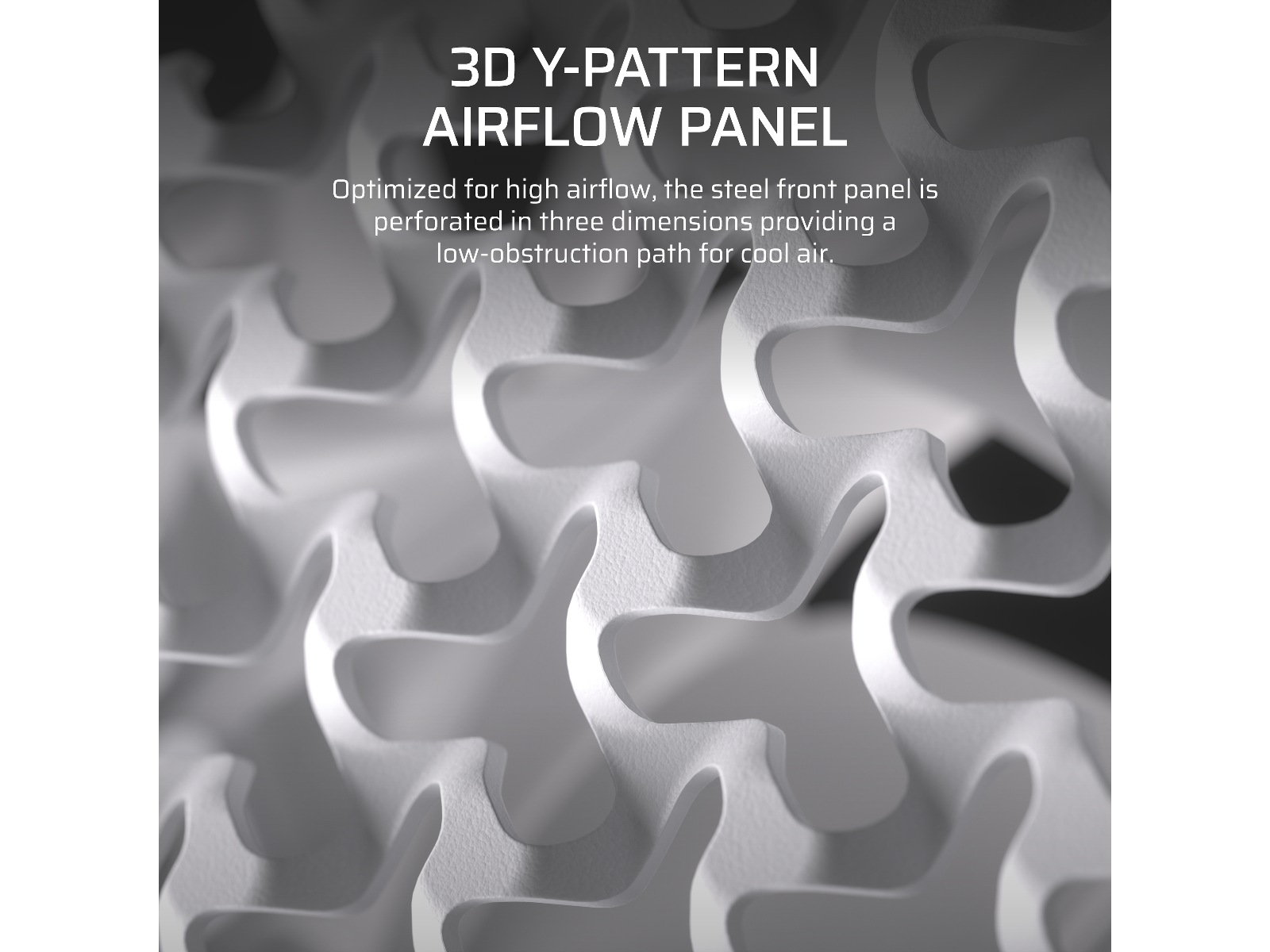 • 3D Y-mønster luftstrømspanel – Optimalisert for høy luftstrøm og minimal restriksjon, er stålpanelet foran perforert i tre dimensjoner med et Y-mønster som gir en forhindringsfri vei for kjølig luft.