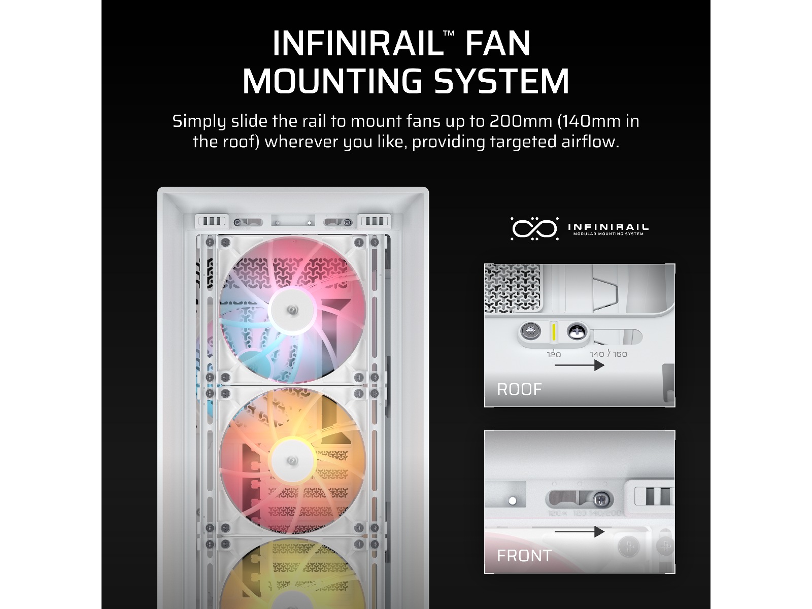 • InfiniRail™ vifte monteringsalternativer - Monter opptil 14x 120mm vifter samtidig for å holde kjølig luft i gang og varm luft raskt og effektivt utslipp, eller juster enkelt InfiniRail™ viftefester for 140mm eller 200mm vifteposisjoner. Kombinasjonene er nesten uendelige.