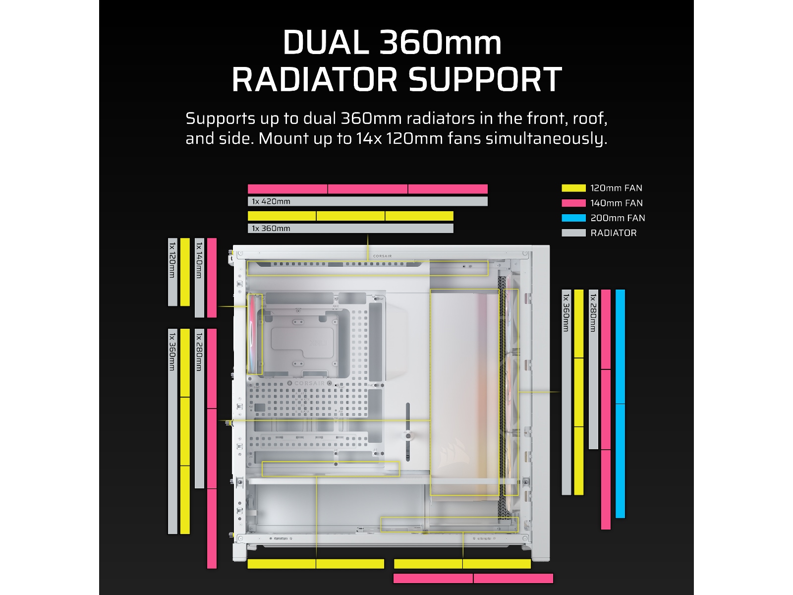 • Støtte for 420mm radiator på toppen – Ta kjølingen til neste nivå med en toppmontert 420mm radiator og plass til 360mm radiatorer foran eller på siden.