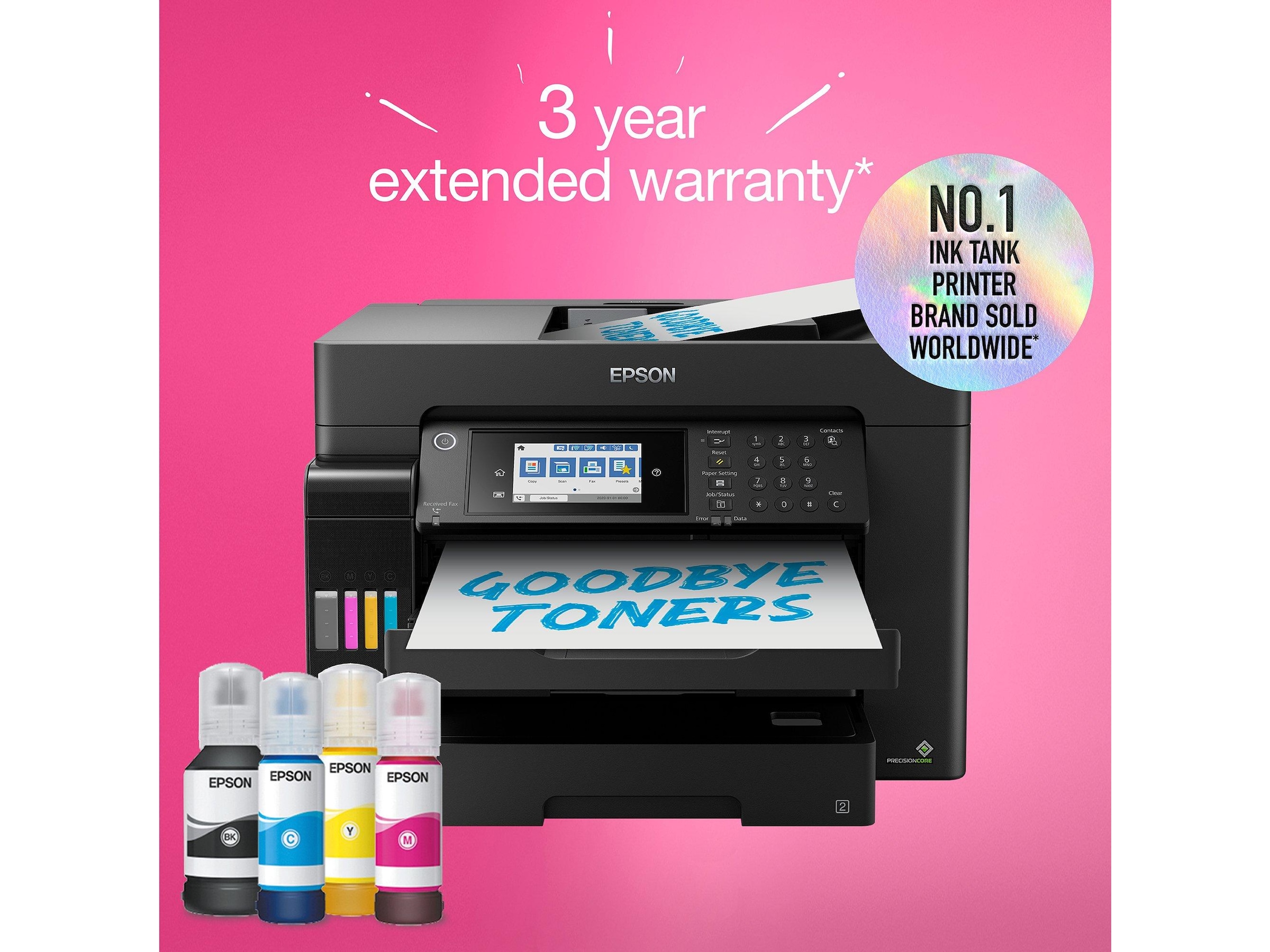 Denne høytytende A3+ multifunksjonelle EcoTank-skriveren med faks har blekktanker som kan fylles på for å levere kontorutskrifter med svært lave kostnader. Funksjoner inkluderer 500-arks- frontskuffkapasitet, 50-arks-papirmating bak og automatisk 50-arks-dokumentmater. Skriv ut slik du vil med mobil utskrift, Ethernet og en 10,9 cm LCD-berøringsskjerm med knapper.