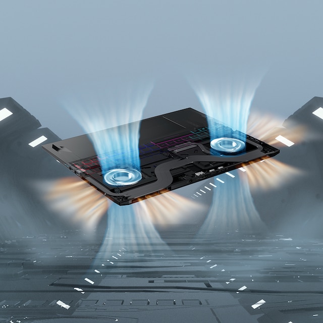 Det avanserte kjølesystemet er bygd for utholdenhet og sikrer urokkelig ytelse, selv under ekstra intense økter. Med en arkitektur med to vifter, design med fire inntak og utløp, og kjølepasta med flytende metall på CPU-en, yter denne maskinen sterkt i det helt avgjørende øyeblikkene.