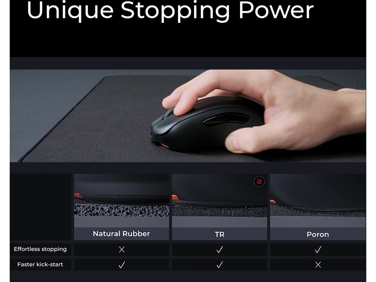 TR-basen's overlegen elastisitet sikrer jevne overganger fra stopp til bevegelse. I motsetning til andre myke musematter, gir dens raske tilbakeslag stabil og sømløs musebevegelse.
