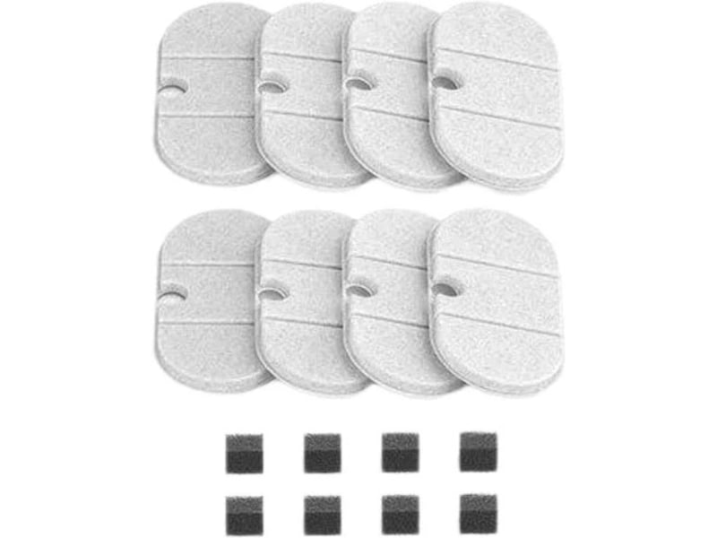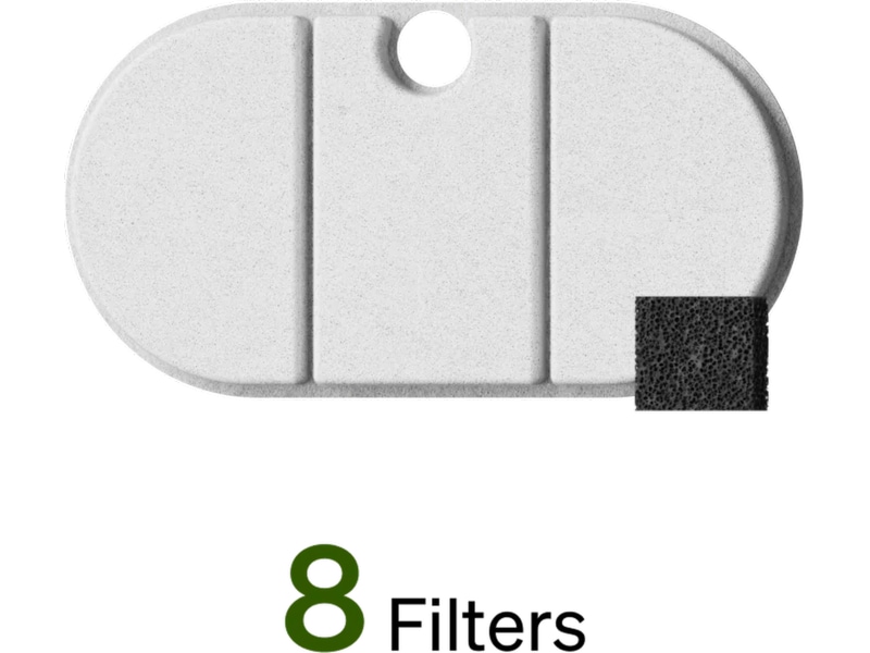 Åtte filtre til din Capsule Fountain fra Petlibro. Filteret inneholder bomull, aktivt kull og ionebyttermasse, som effektivt fjerner hår, lukt og tungmetaller. Dette sørger for at kjæledyrene dine får rent og friskt vann hver dag, og reduserer risikoen for urinveisinfeksjoner.
