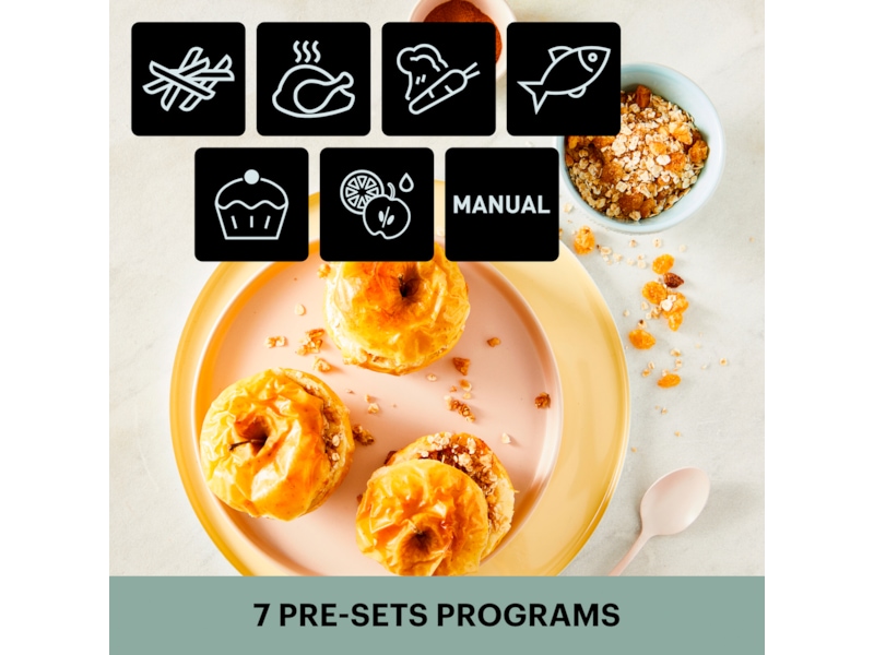 | Funksjoner og innstillinger | Grønnsaksfunksjon, Pommes frites-funksjon, Manuell funksjon, Funksjon for synkron matlaging, Kyllingfunksjon, Dessertfunksjon, Dehydreringsfunksjon, Fiskefunksjon |