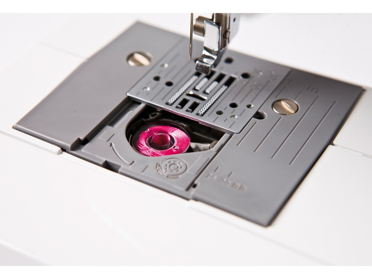 Maskinen er lett å tre med drop-in spolesystem og har en praktisk friarm til å sy i bukseben og armer, samt LED-belysning.
