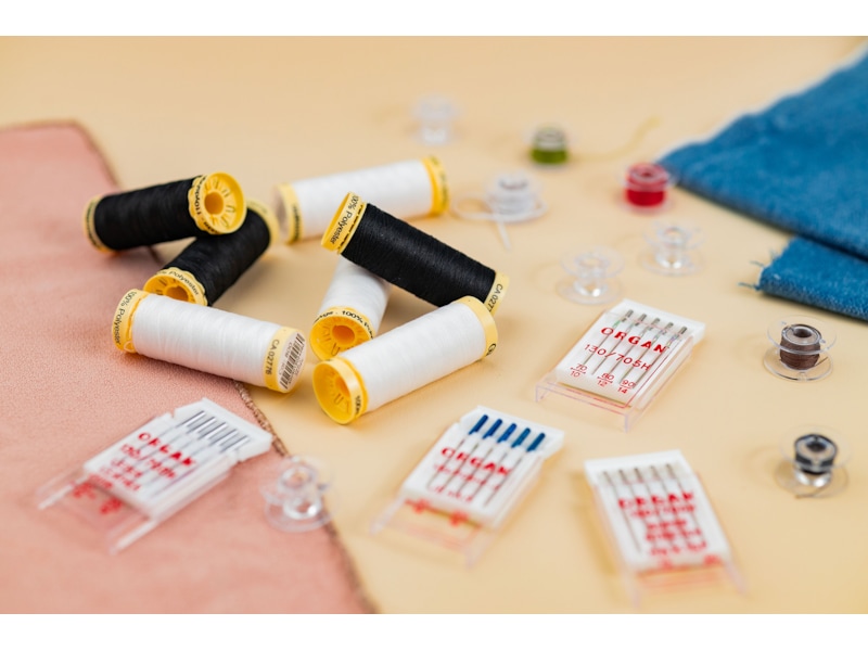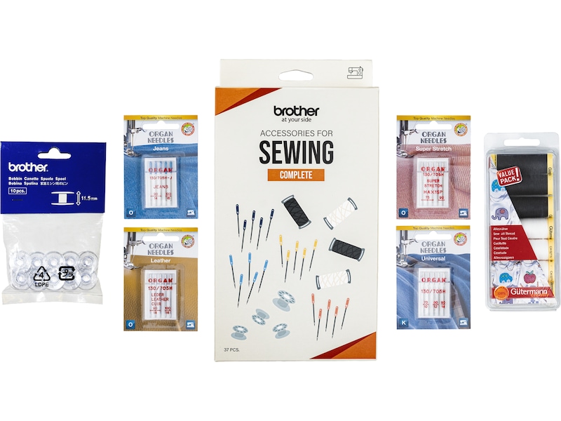 5 x Organ universalnåler, 5 x Organ jeansnål, 5 x Organ super stretch-nål, 5 x Organ lærnål, 1 x Gütermann trådsett (7 sneller) og 10 x spoler fra Brother.