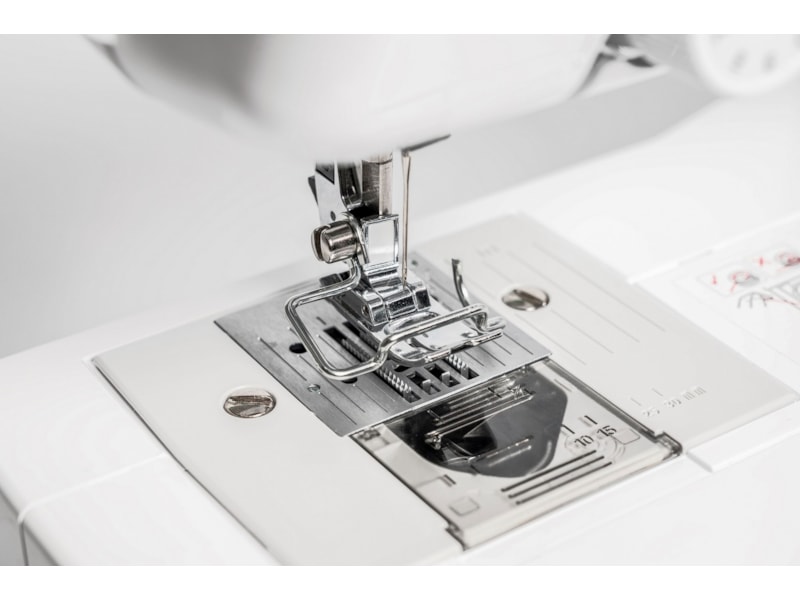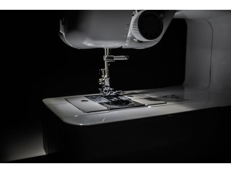 Maskinen er lett å tre med drop-in spolesystem og har en praktisk friarm til å sy i bukseben og armer, samt LED-belysning.