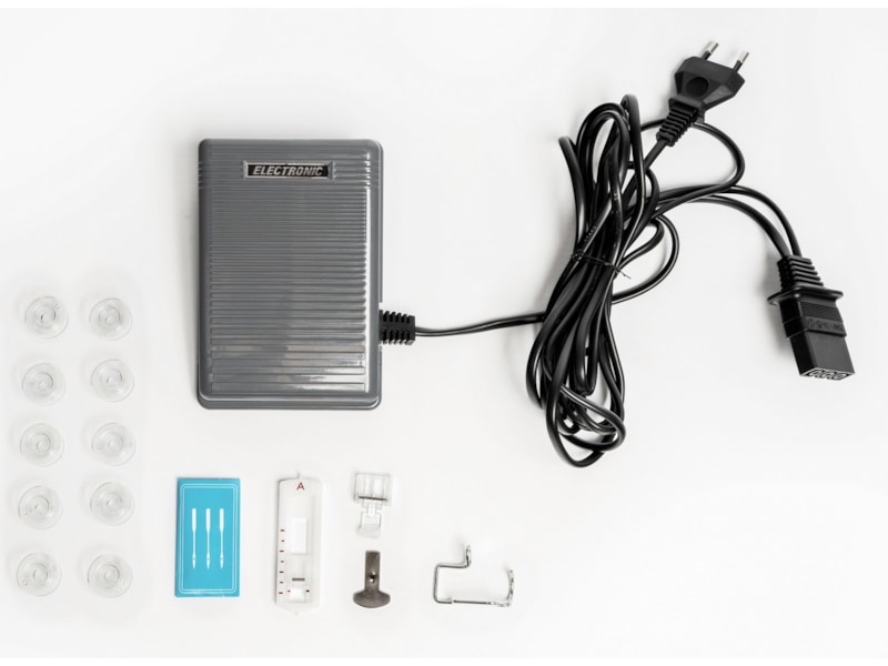 - Trykkfot: Sikksakkfot (sitter på maskinen fra start), knapphullsfot og glidelåsfot
