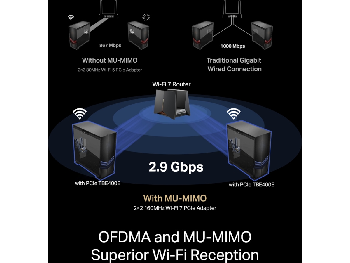 Archer TBE400E tar PC-ens Wi-Fi mottak til neste nivå med den revolusjonerende kombinasjonen av OFDMA og MU-MIMO. Dette sikrer effektiviteten til PC-ens Wi-Fi tilkobling ved å la flere enheter kommunisere med ruteren din samtidig, i stedet for å vente tur for data.