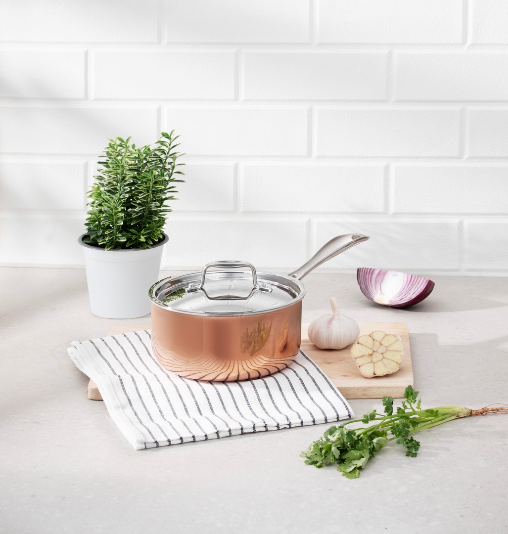 Kasserollen fungerer på alle typer koketopper, inkludert induksjon, og har praktiske målemarkeringer på innsiden for enkel dosering. Det svale håndtaket gjør den behagelig å bruke, mens kobberfinishen gir både holdbarhet og et tidløst, stilrent utseende.