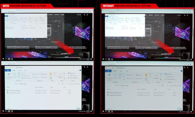 Når den ROG-eksklusive innstillingen Uniform Brightness i OSD-menyen er aktivert, reduseres den maksimale lysstyrken for å holde nivåene konsistente og gi bedre visning, selv når du endrer størrelsen på lyse, hvite vinduer. Det gjør også maratonspilløkter mye mer behagelige for øynene.