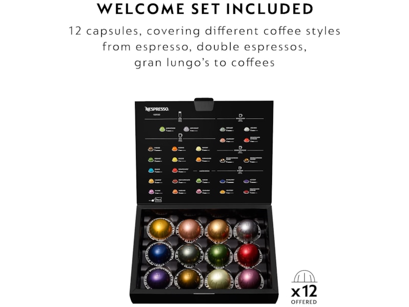 - En Nespresso kaffemaskine til 7 kopstørrelser: en pefekt kop Ristretto (25 ml), Espresso (40 ml), Double Espresso (80 ml), Gran Lungo (150 ml), Mug (230 ml), XL Coffee (355 ml) og en Kaffe i kanne (535 ml).