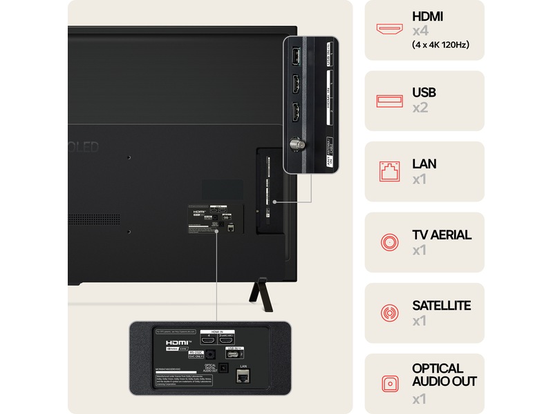 | Egenskaper | AI Concierge, Freesync, Always Ready, Støtte for Apple AirPlay 2, AI Genre Selection, Game Dashboard, Family Settings, AI Brightness Control, Cloud Gaming, Støtte for USB-nettkamera, G-SYNC Compatible, 4K High Frame Rate (HFR), AI Picture Wizard |