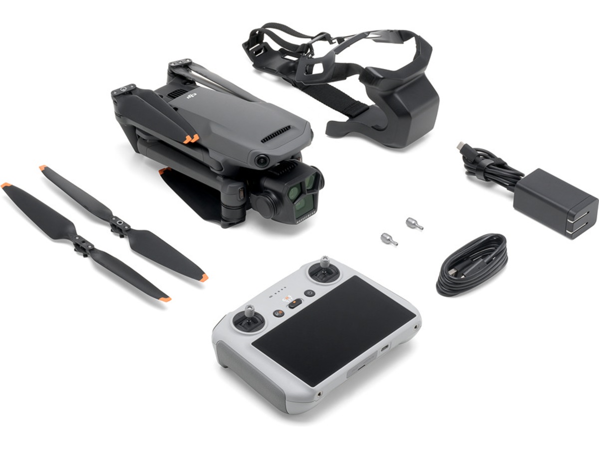Pakkeinnhold Lagerdeksel, Et par ekstra kontrollpinner, 3 par lavstøyspropeller, Kommunikasjonskabel (USB 3.0 type-C), Bærbar lader (65 W), DJI RC-fjernkontroll, Intelligent flybatteri