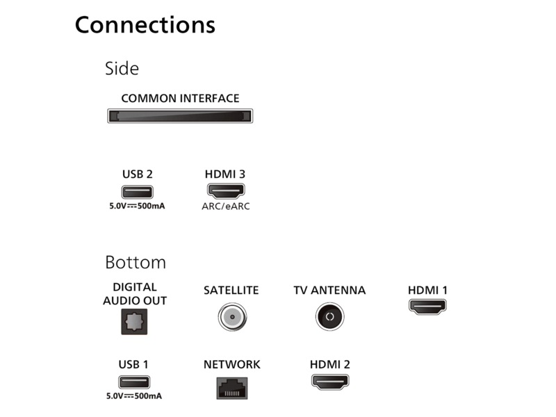LAN - bunn, USB - side, USB - bunn, Digital lydutgang (optisk) - bunn, 2 x HDMI - bunn, HDMI - side