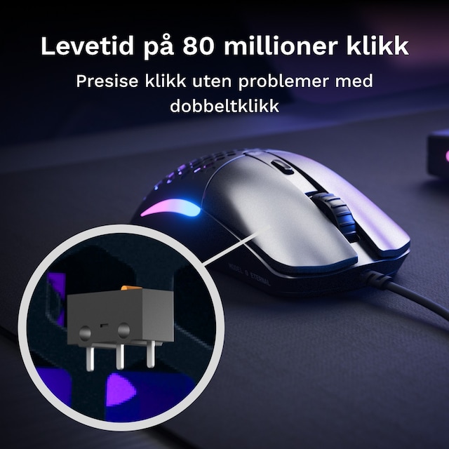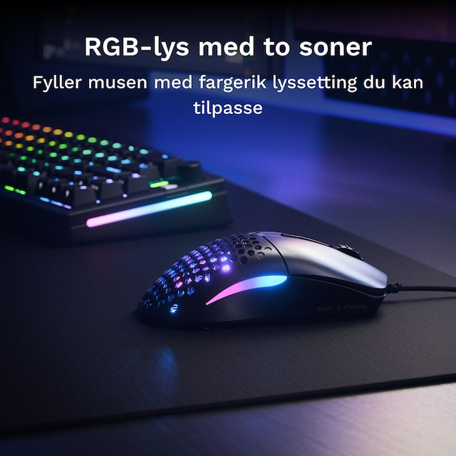 Den ultralette Model O Eternal RGB-spillmusen leverer prisbelønt form, fart og presisjon i et design som bare veier 55 g. Med 6 knapper, RGB-sidepaneler og levetid på 80 millioner klikk er den bygget for å vinne. Med en 12K DPI-sensor blir sporingen perfekt, så hvis du bommer, er det din egen feil.