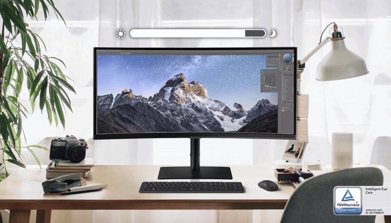 Unngå å anstrenge øynene. For prosjekter som pågår til langt utpå kvelden, optimaliseres lysstyrken og fargetemperaturen automatisk etter omgivelsene. Samsungs TUV-sertifisering for intelligent øyepleie reduserer skjermflimmer og beskytter øynene mot blått lys med Eye Saver Mode.