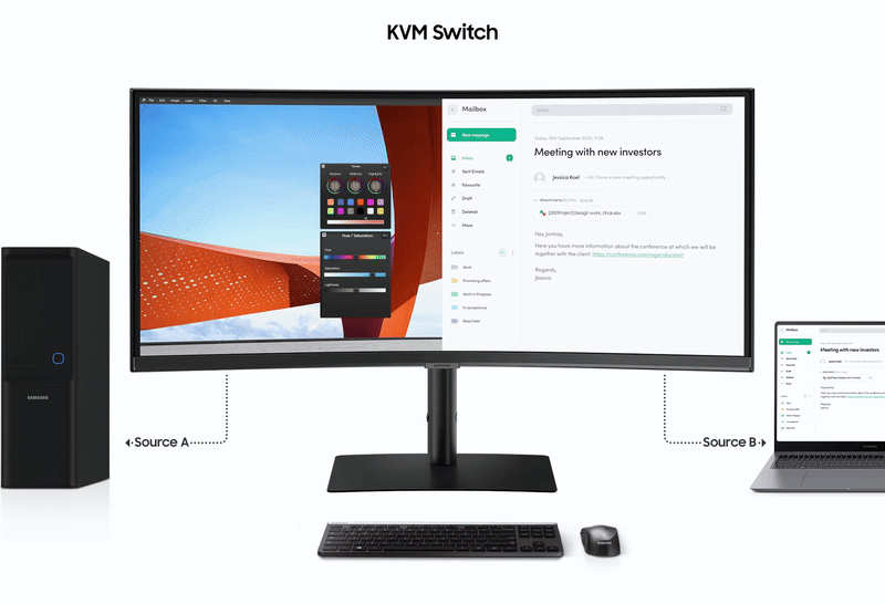 En innebygd KVM-bryter lar deg koble til og styre to bildekilder til skjermen samtidig, med samme tastatur og mus. Velg mellom Split Screen, Picture in Picture eller Picture by Picture. Bli mer effektiv og unngå tilkoblingsproblemer med flere enheter takket være smidig veksling mellom inndataenheter og multitasking.