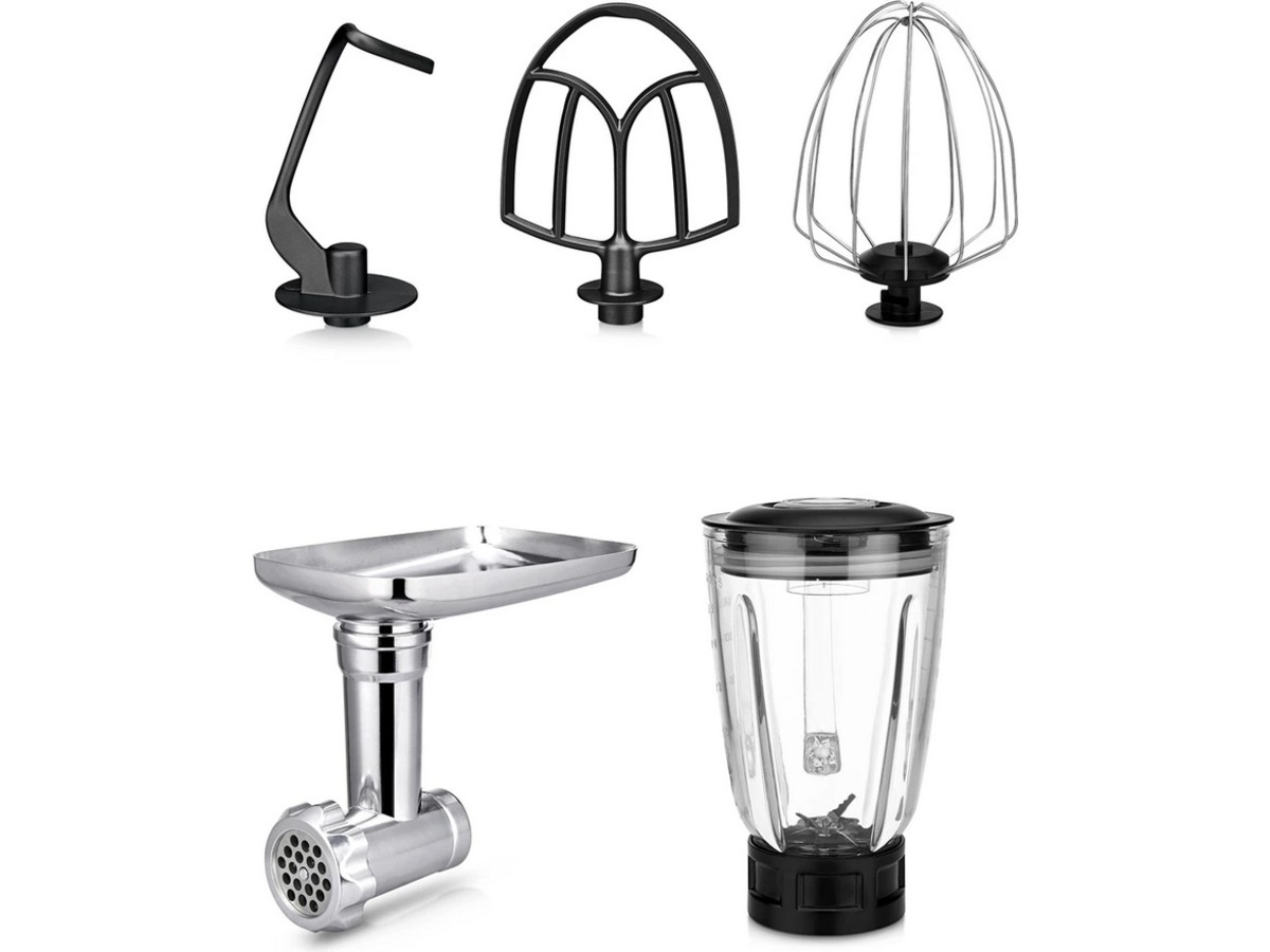 Inkludert tilbehør Ballongvisp, Grov slipeskive, Kjøttkvernstilbehør, Teflonbelagt visper, Blendermuggetilbehør, Kebbe-tlibehør, Teflonbelagt deigkrok, Pølsetilbehør, Fin slipeskive, Medium slipeskive