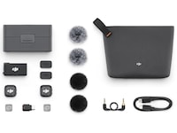 2 mikrofonklipsmagnet, Bærepose, 2 mikrofonvindskjermer (grå), 2 magneter, 2 mikrofonvindskjermer (svart), Ladeboks (1950 mAh), USB-C-kabel, Smarttelefonadapter (USB-C), 3,5 mm-lydkabel |