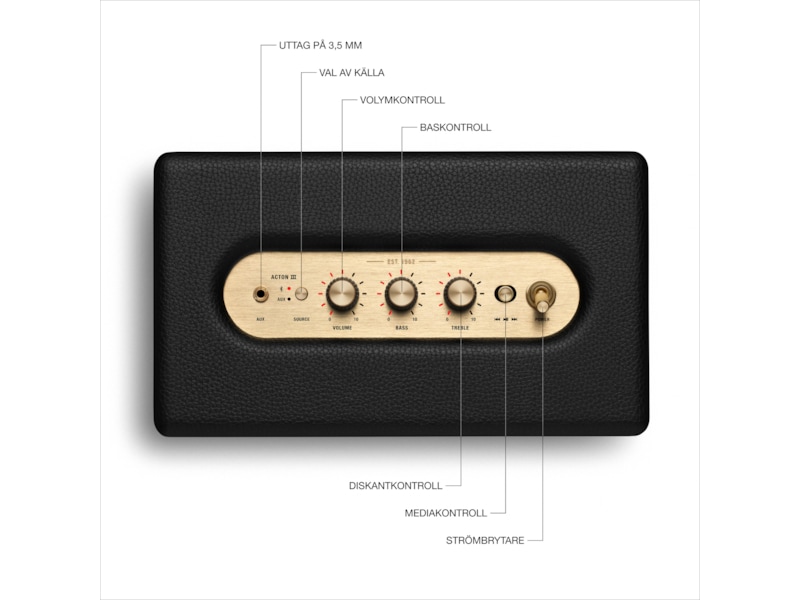 Bass, Volum, Avspille/pause, Inngangsvelger, Hoppe over, Strøm på/av, Diskant