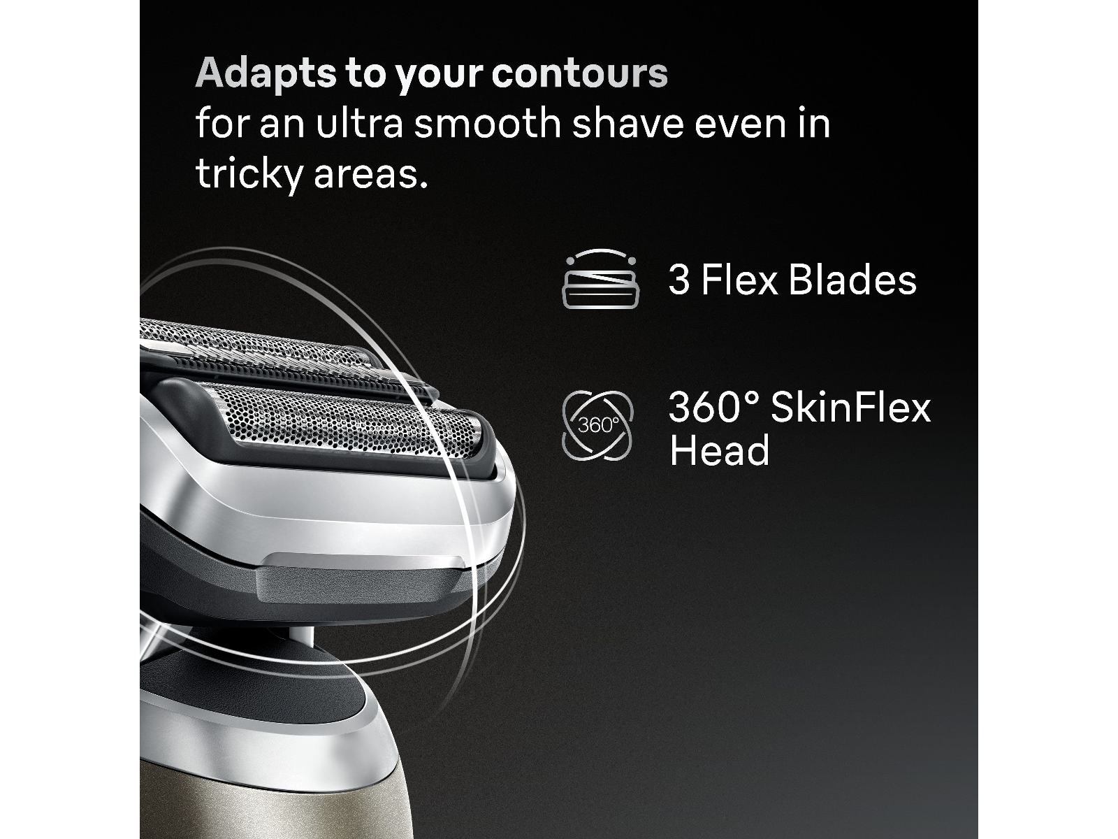 Det fleksible 360° SkinFlex-hodet og 3 Flex-blader tilpasser seg dine ansiktskonturer for en ultratett barbering, også på vanskelig tilgjengelige områder.