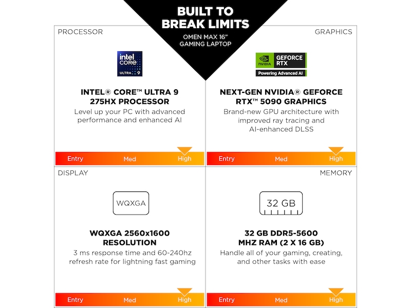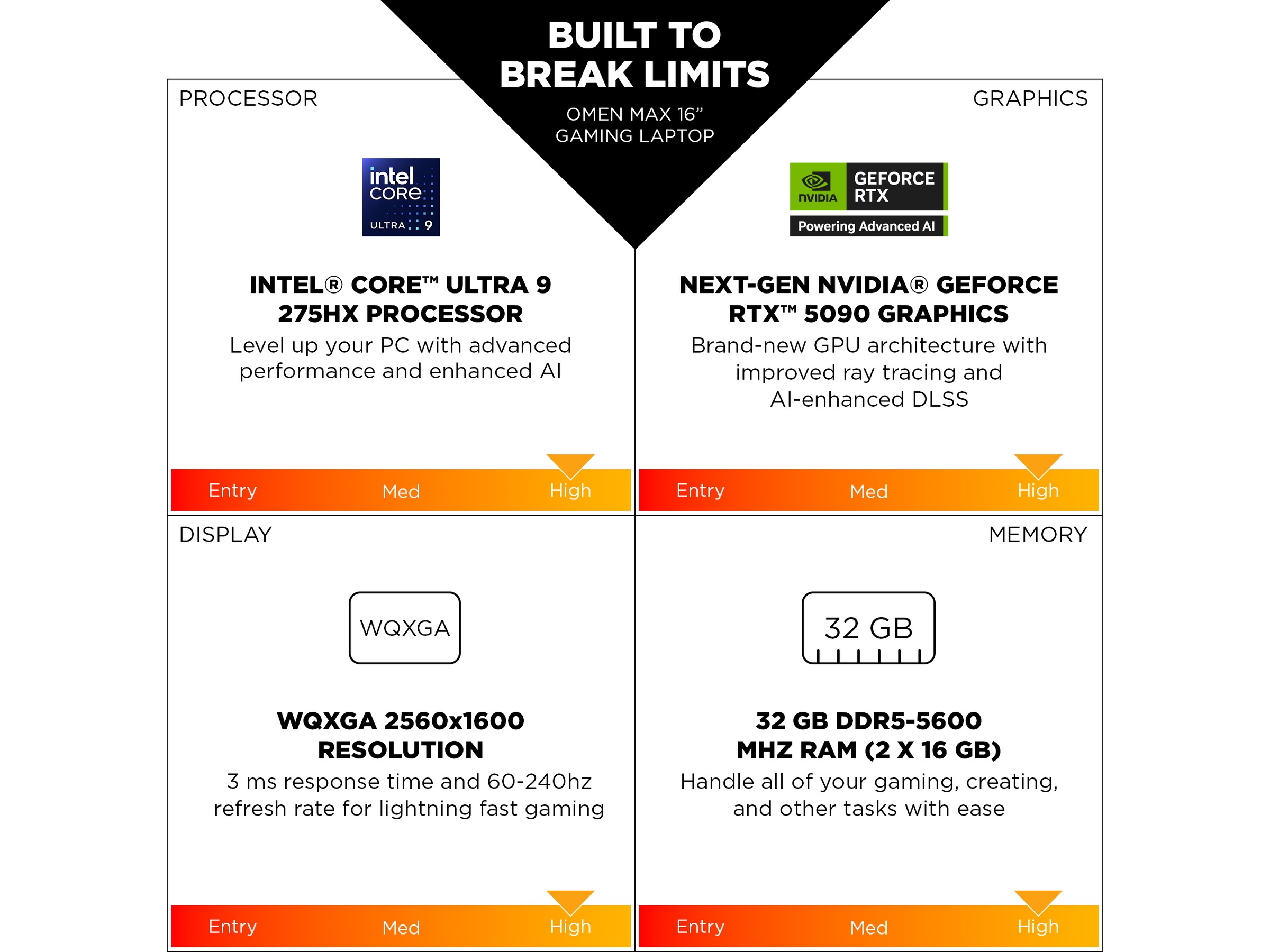 OMEN 16 MAX bærbar gaming-PC leverer uovertruffen ytelse både hjemme og på farten. Med neste generasjons NVIDIA® GPU-er og Intel® Core™ Ultra-prosessorer, en ny Unleashed-modus for manuell overklokking og en termisk arkitektur bygget for å redusere begrensning og langvarig slitasje, kan dedikerte spillere oppnå sitt beste i årene som kommer.
