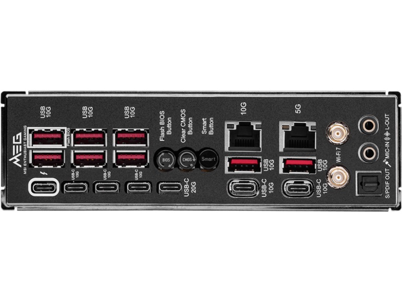 Grensesnitt 1 x mikrofon - minijakk, 1 x USB-C 3.2 Gen2x2, 1 x SPDIF-utgang, 8 x USB 3.2 Gen 2, 1 x lydutlinje - minijakk, 2 x antenne, 1 x Thunderbolt 4, 1 x LAN (10Gigabit Ethernet), 1 x LAN (5Gigabit Ethernet), 5 x USB-C 3.2 Gen 2